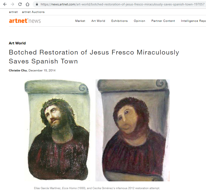 In 2012 Cecilia Giménez, an 83-year-old widow and amateur painter, attempted to restore a century-old fresco of Jesus crowned with thorns in her local church in Borja, Spain. The restoration didn’t go very well, but, surprisingly, the botched restoration of Jesus fresco miraculously saved the Spanish Town.