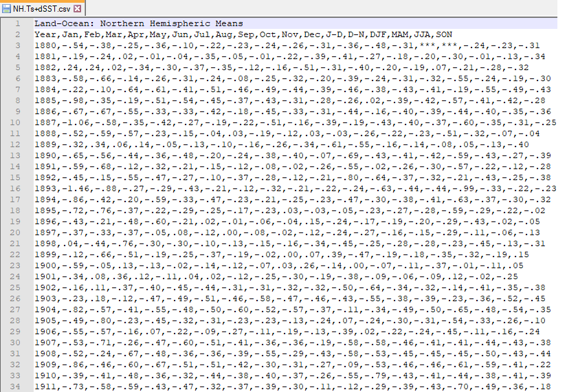 CSV file names end with a .csv and if you opened one inside Excel, it would look like a regular Excel file. NASA provides an estimate of global surface temperature change which allows us to calculate weather anomalies. The data is available at https://data.giss.nasa.gov/gistemp/tabledata_v3/NH.Ts+dSST.csv as a CSV file which you open inside Excel looks something like this:
