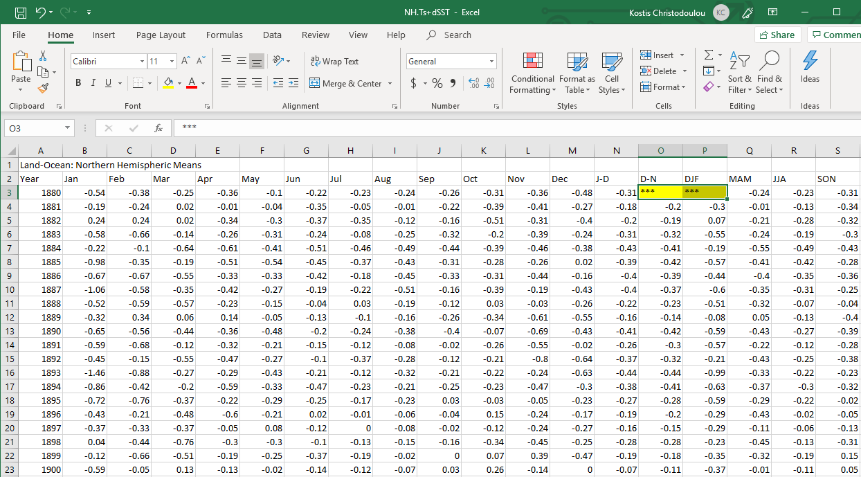 By the way, if you look at the data closely, you will notice that the values in the D-N (December-November) and DJF (December-January-February) columns for the year 1880 are ***. These *** denote a missing value, in the same way that R uses the NA (or not available) value.