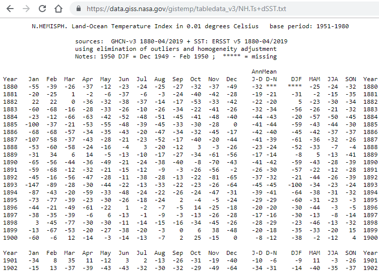 Most people are used to analyze data in a spreadsheet or tabular format. For instance, if we wanted to study climate change, we can find data on the Combined Land-Surface Air and Sea-Surface Water Temperature Anomalies in the Northern Hemisphere at NASA’s Goddard Institute for Space Studies. The tabular data of temperature anomalies can be found here and part of that data set is shown below: