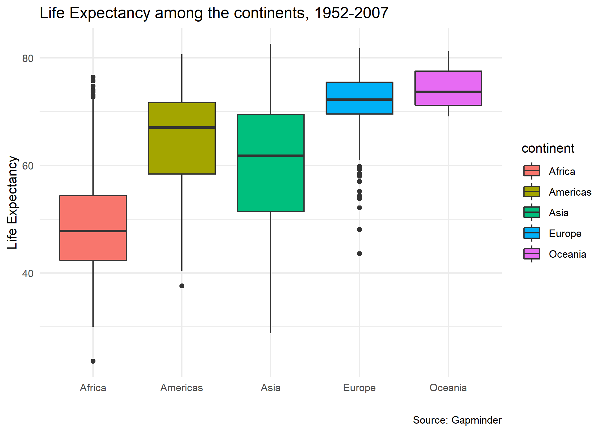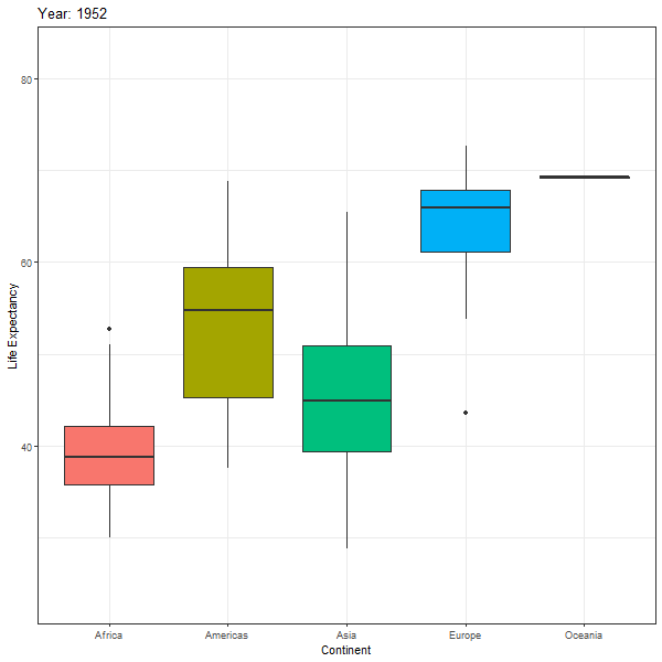 First we look at an animated boxplot of life expectancy by continent over time. The code to produce the plot is fairly straight-forward ggplot, but the last couple of lines ( transition_time(year) + ease_aes("linear")) are the ones that produce the animation.