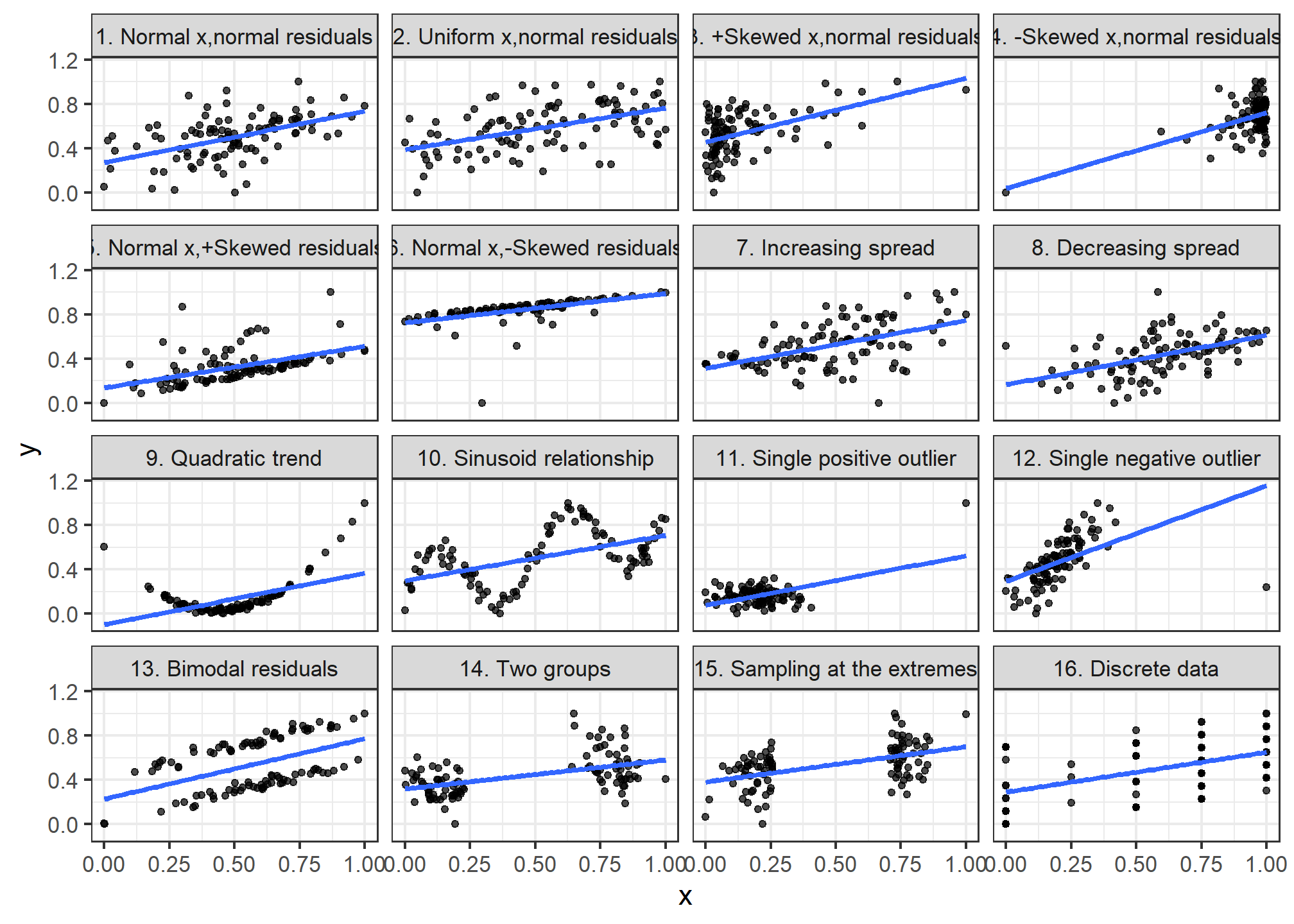 We will visualise 16 different datasets, all of which have a correlation of 0.50, and a sample of size n = 100.