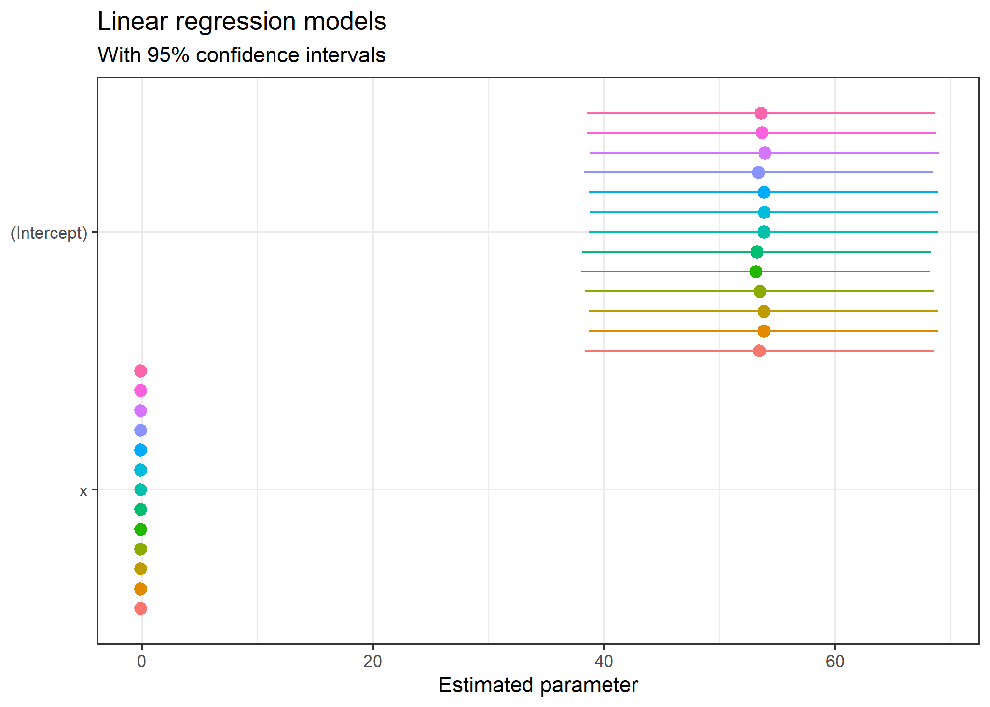 Since our datasets contain values for X and Y, we can estimate 13 regression models and plot the values for each of the 13 intercepts and slope for X.