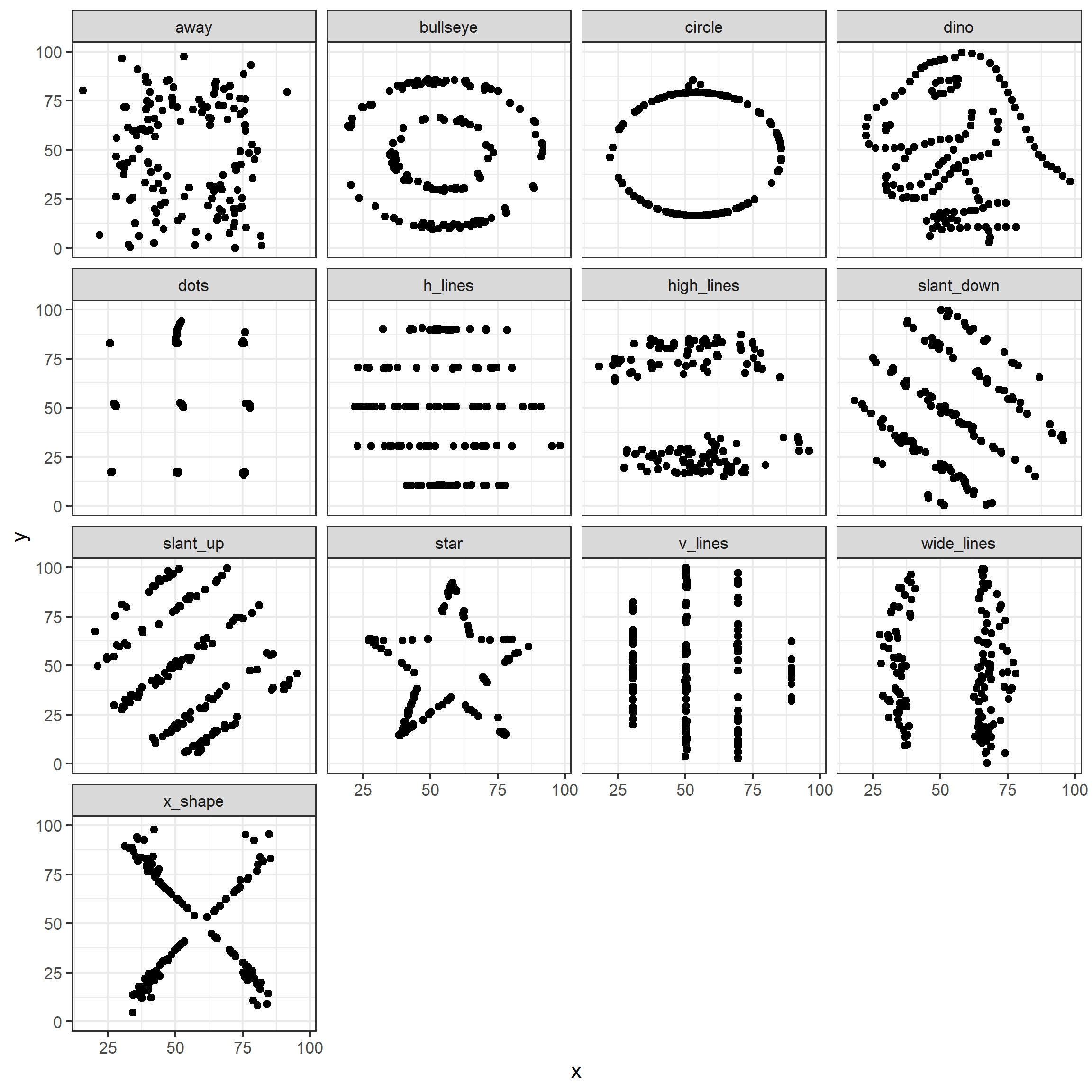 If we just looked at either the summary statistics table, or the plots of intercepts and slopes, we may be tempted to conclude that the 13 datasets are either identical or very much alike. However, this is far from the truth, as this is what the 13 individual datasets look like.