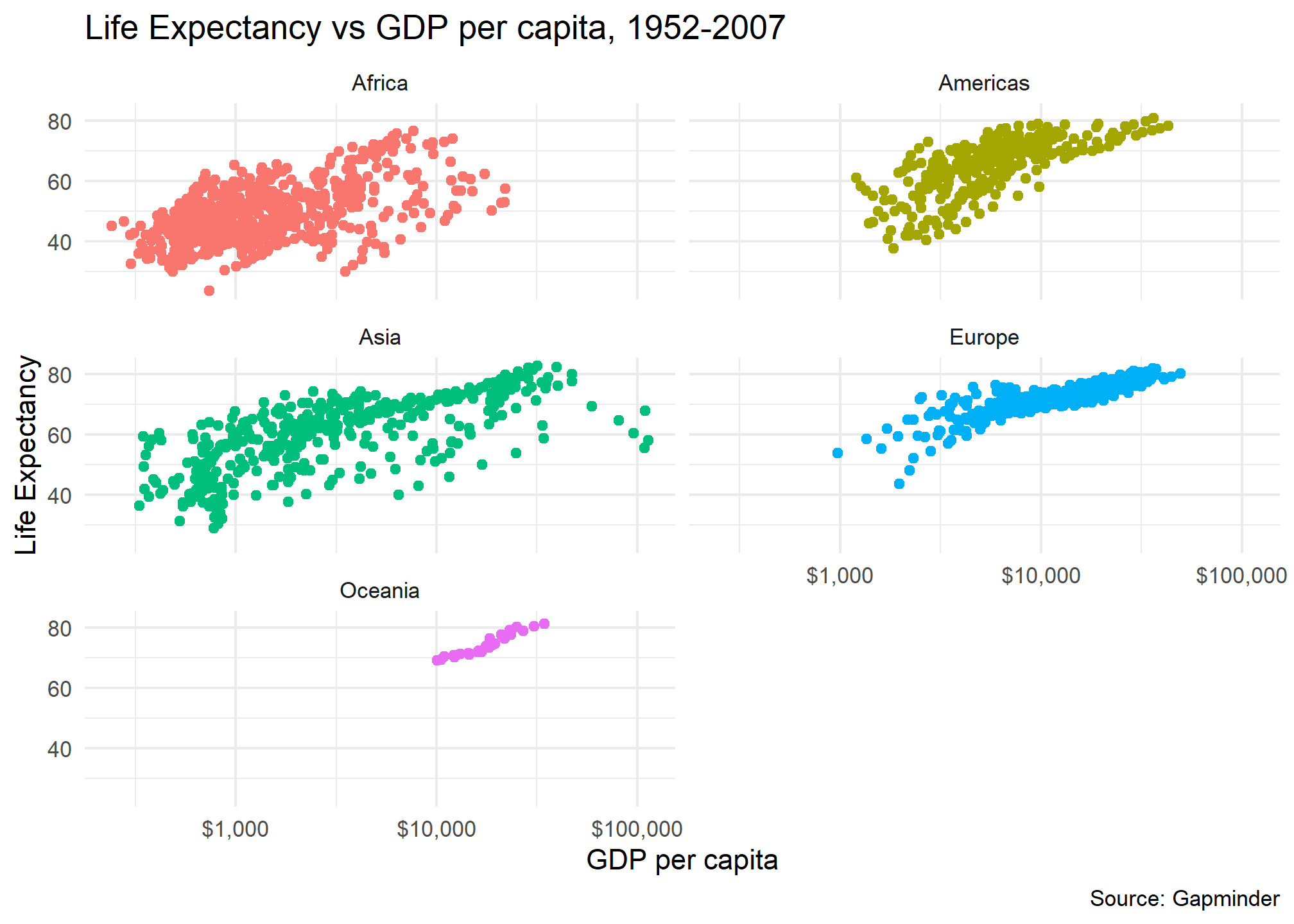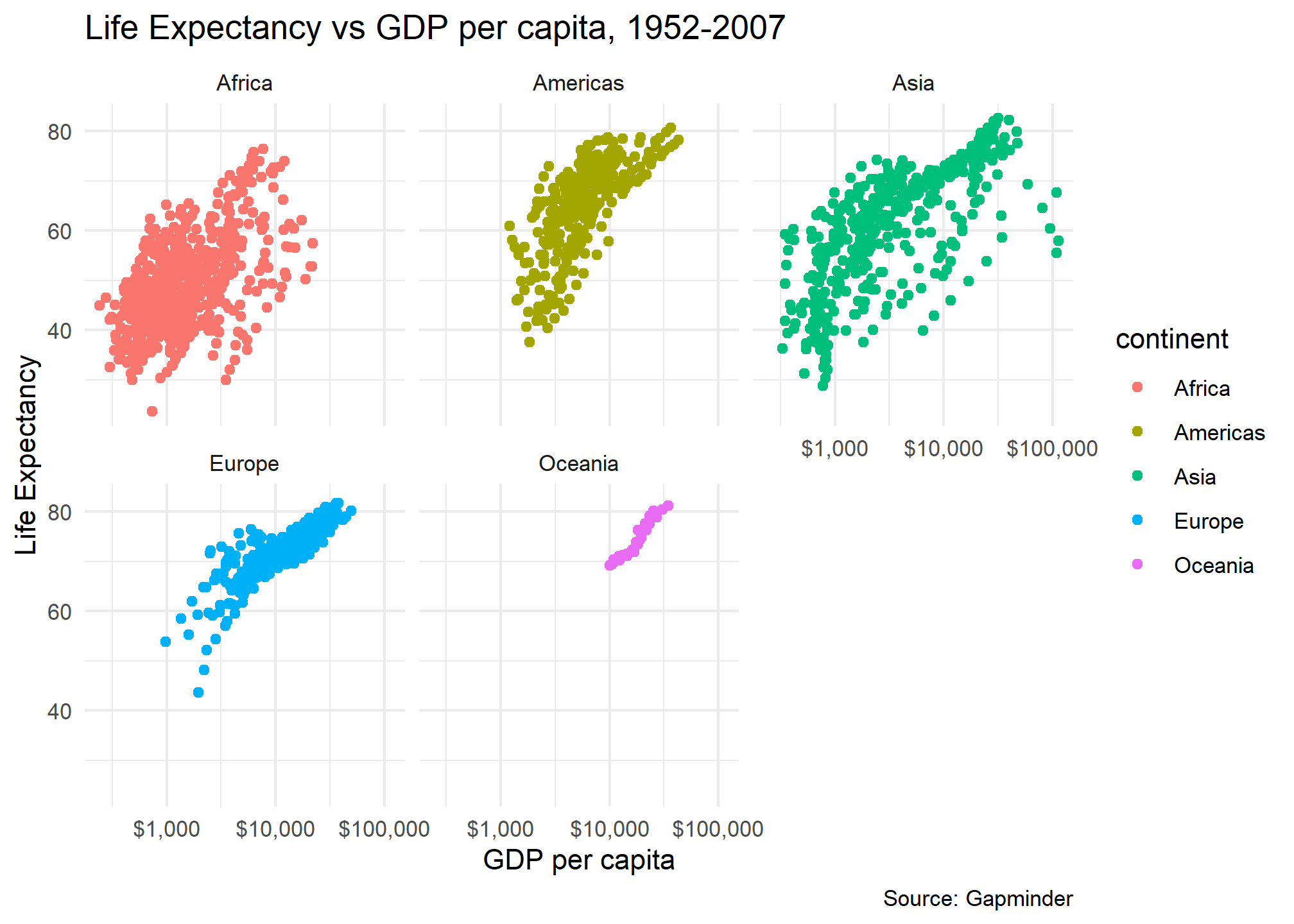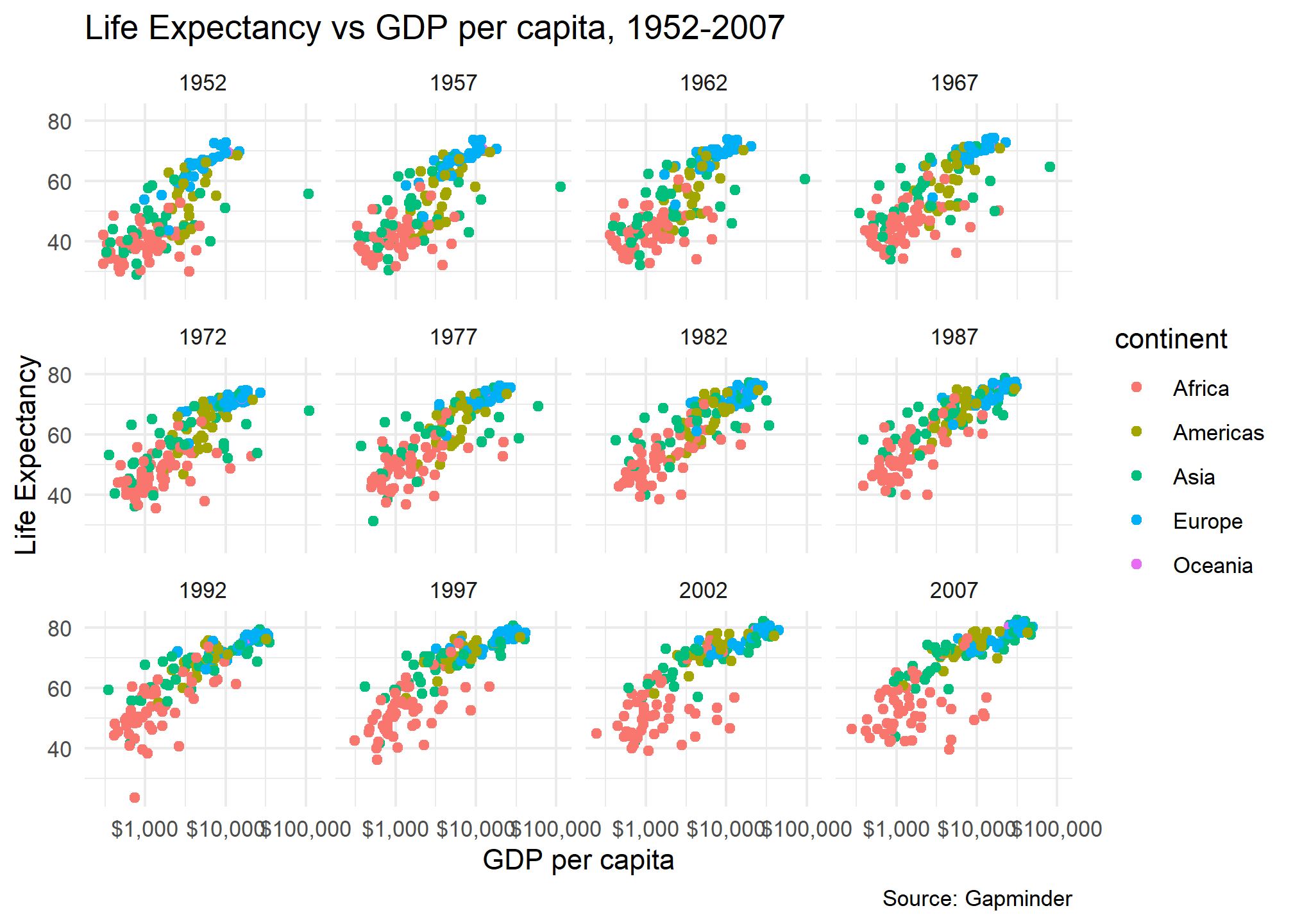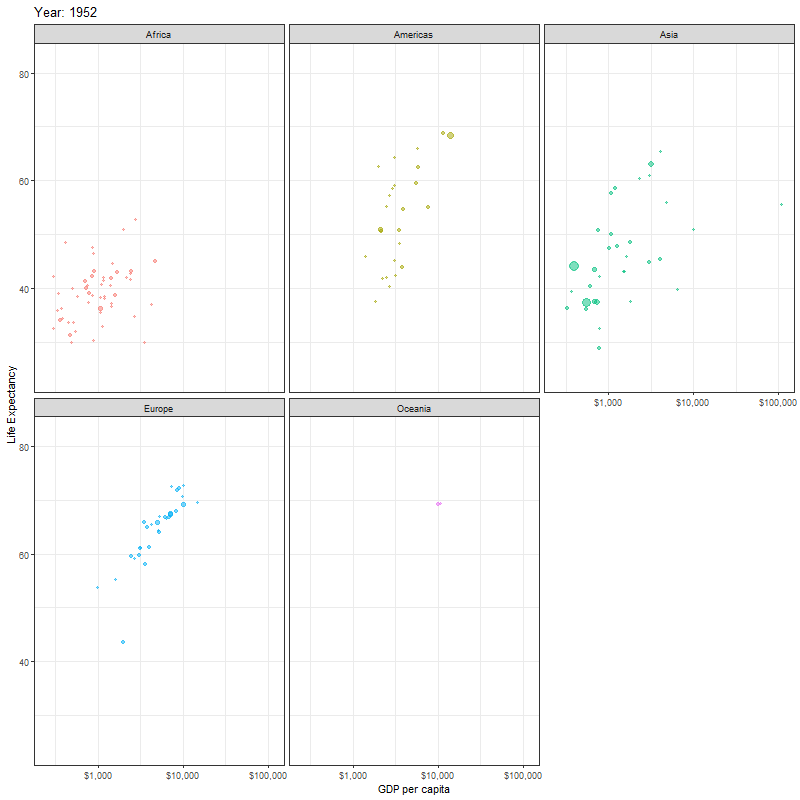 Finally, instead of one scatter plot, if we wanted to facet our animation by continent, we just add the facet_wrap(~continent) line of code as shown below