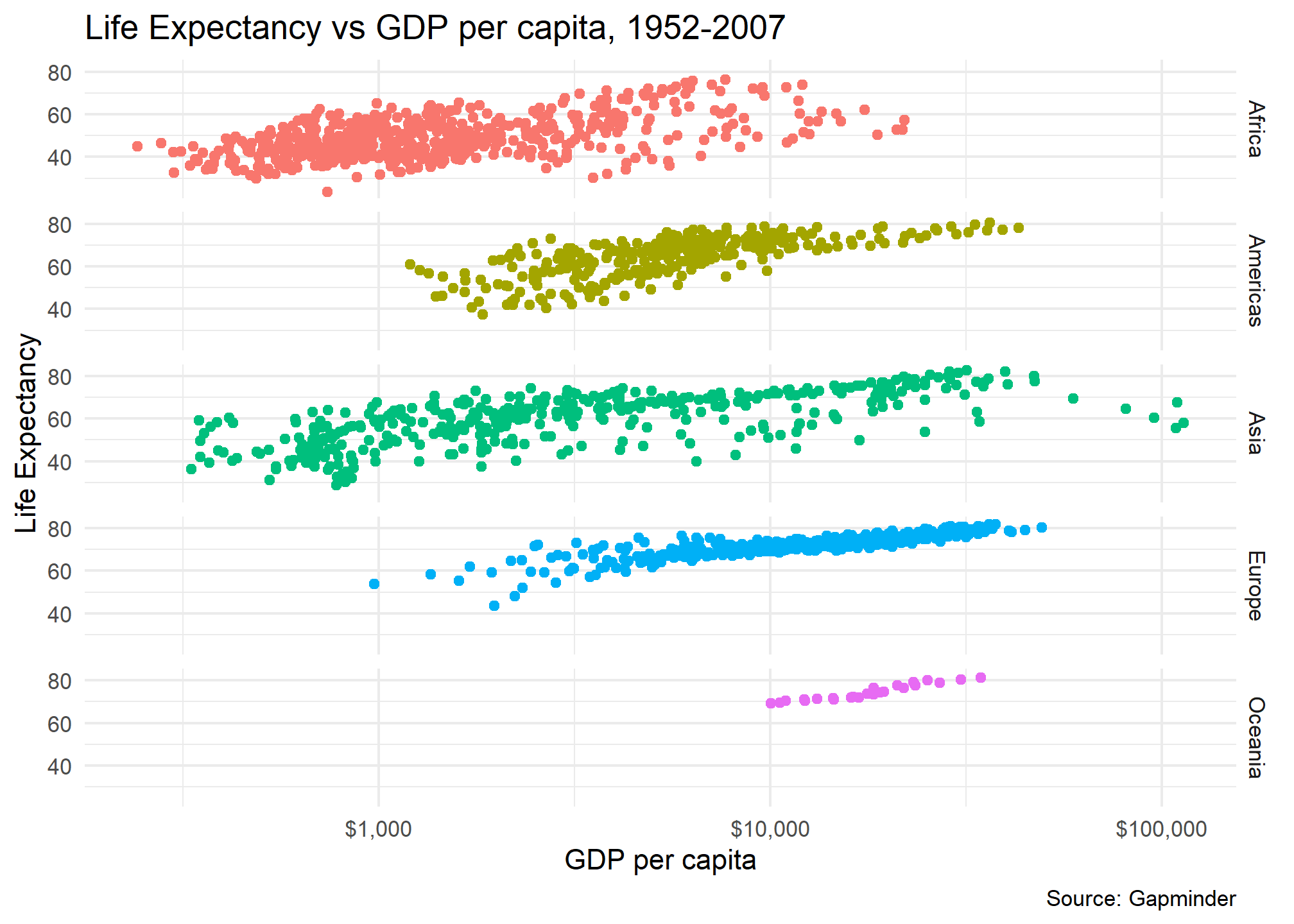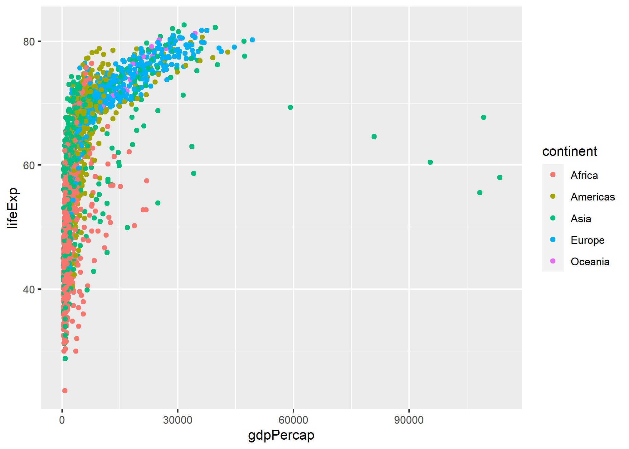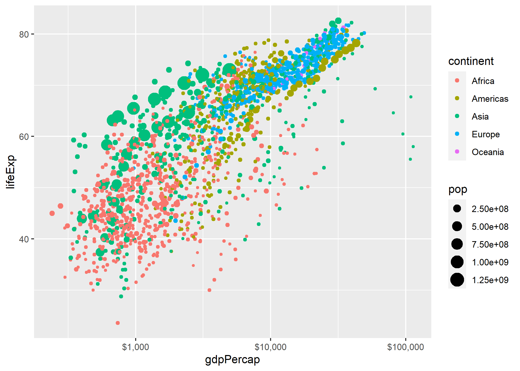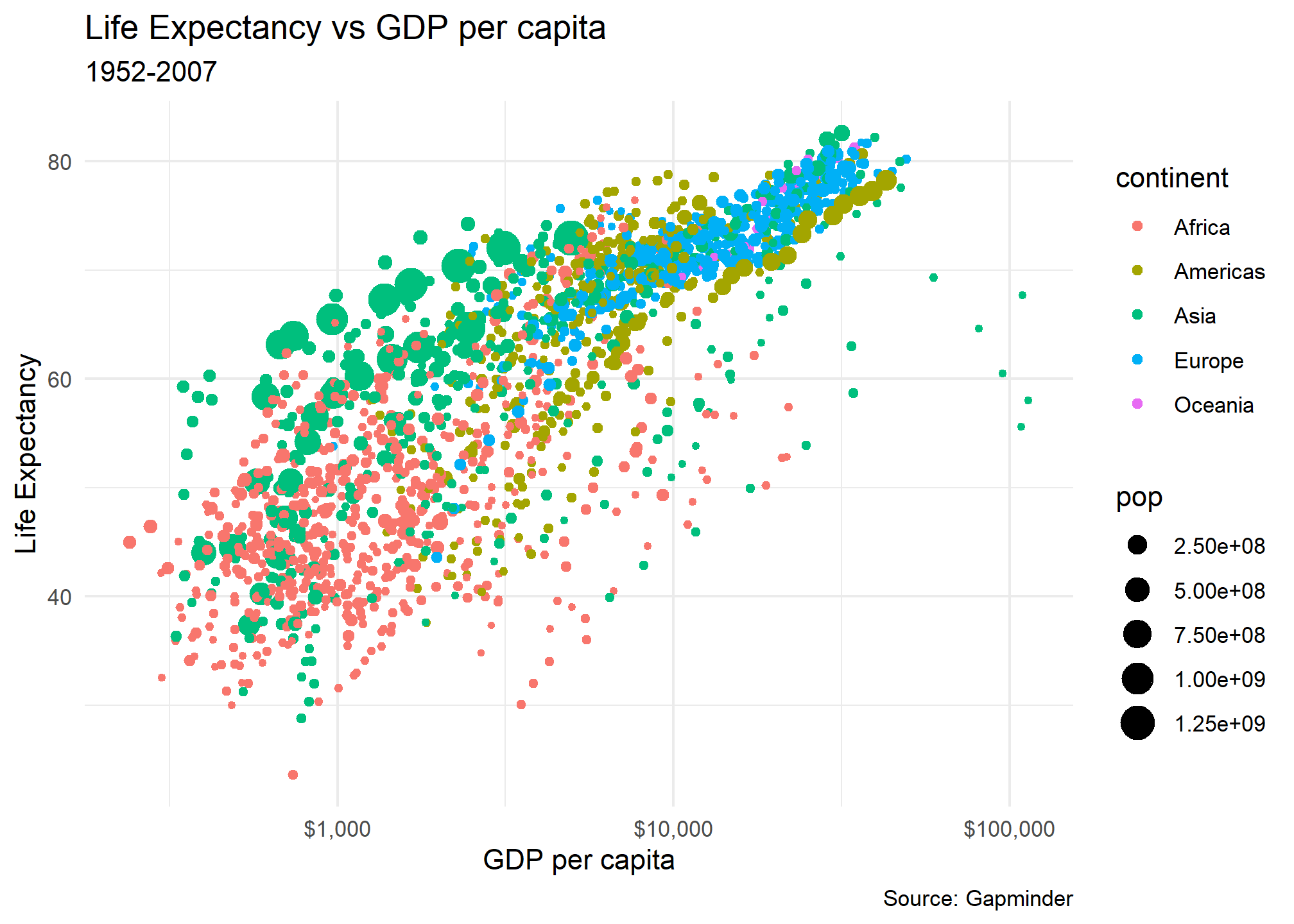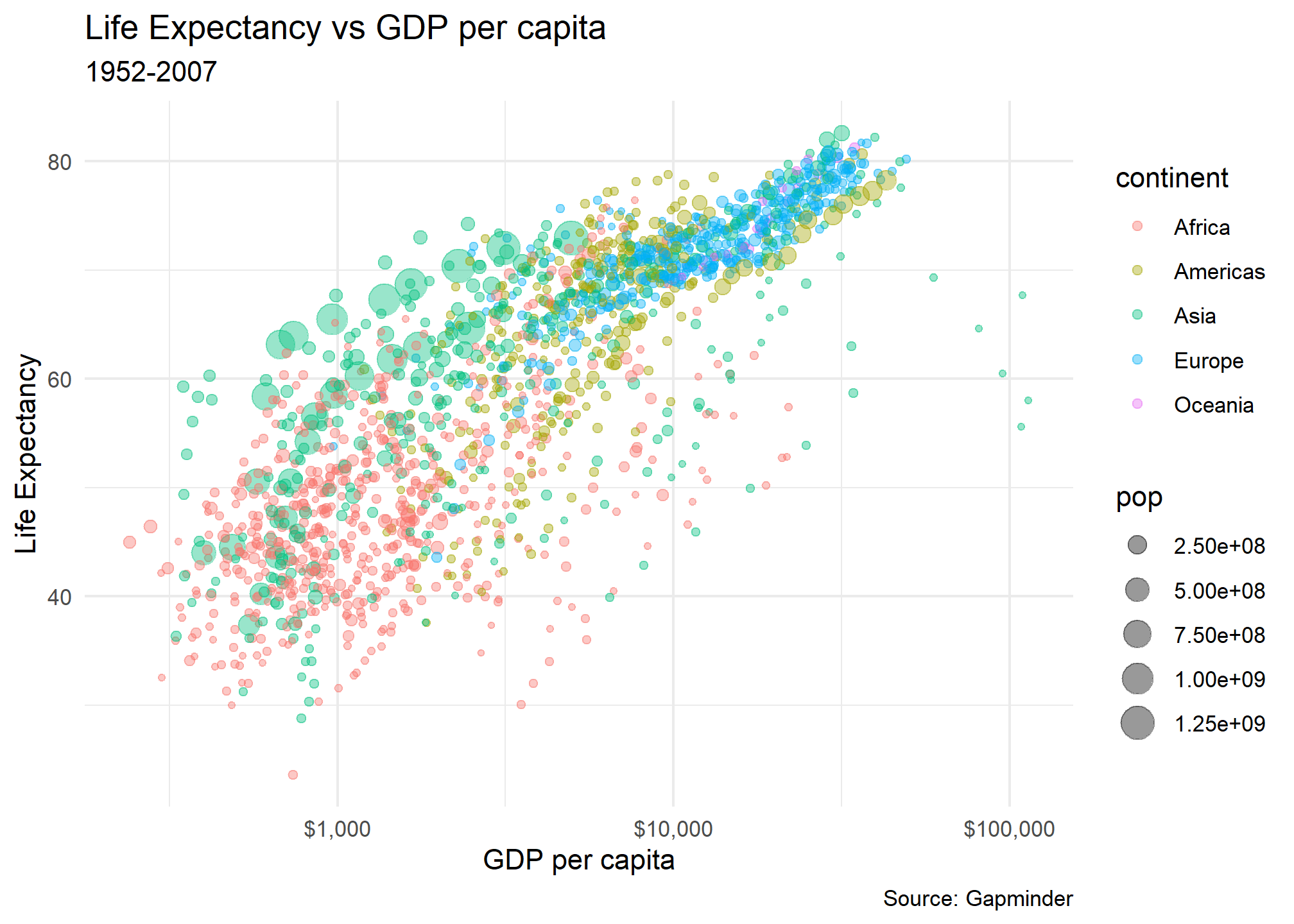 In the following examples, we will use the gapminder dataset with data on life expectancy lifeExp, population pop, and GDP per capita gdpPerCap for a number of countries between 1952 and 2007. We want to build a graph that shows the relationship between GDP per capita and life expectancy.