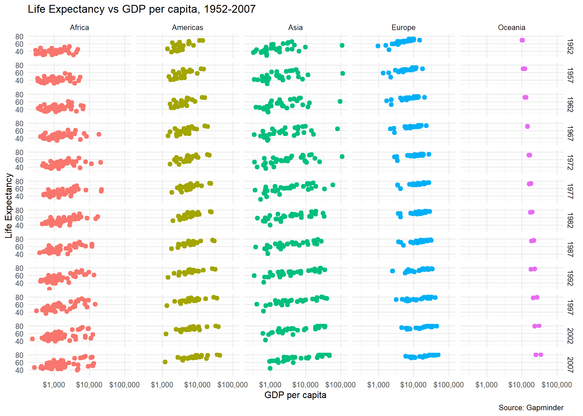 # in our scatterplot, we add a facet_grid() layer where columns = continents and rows = year