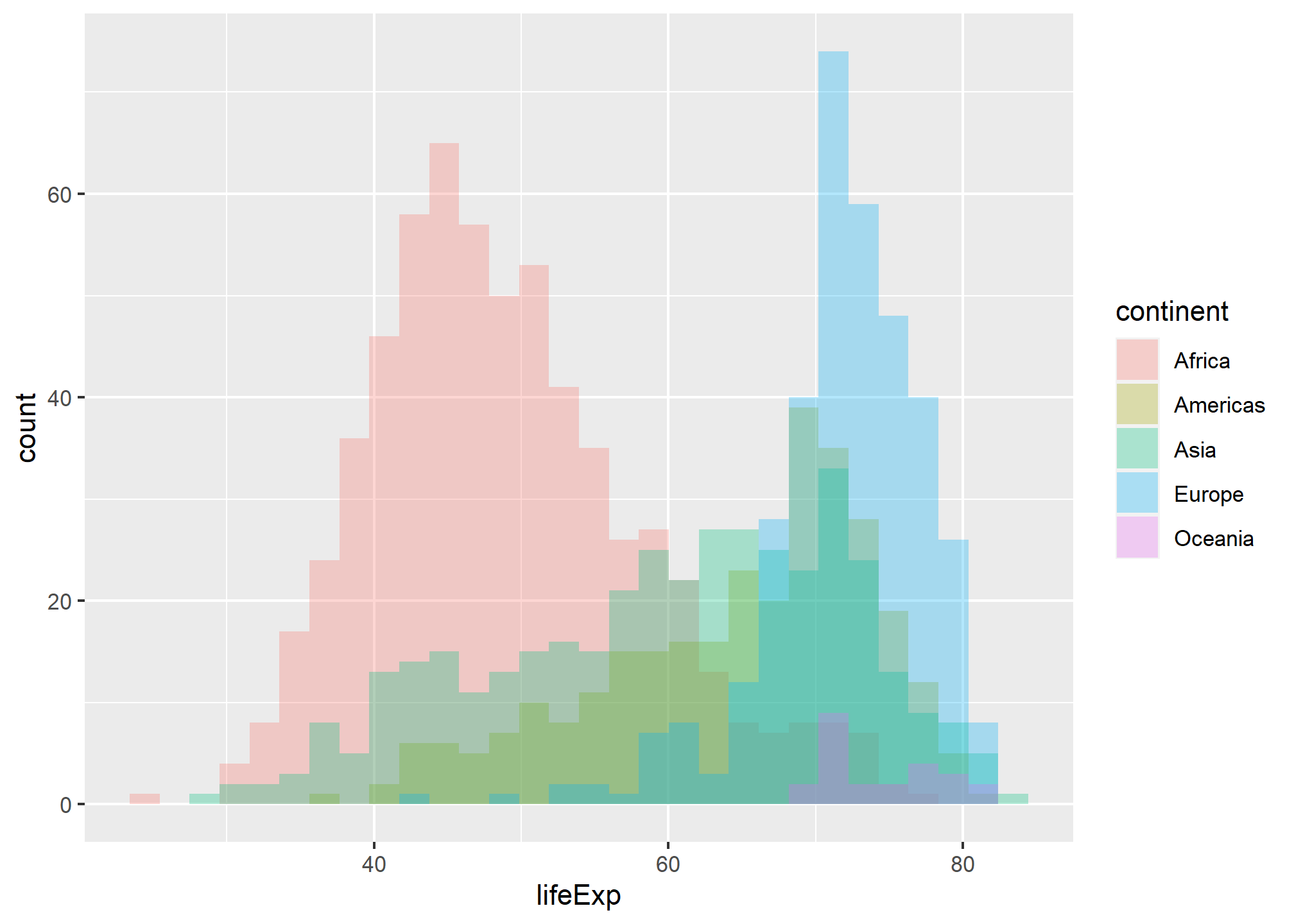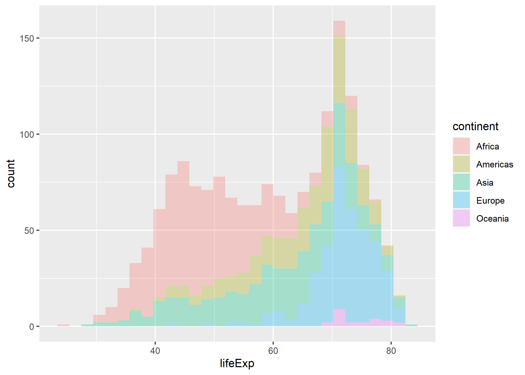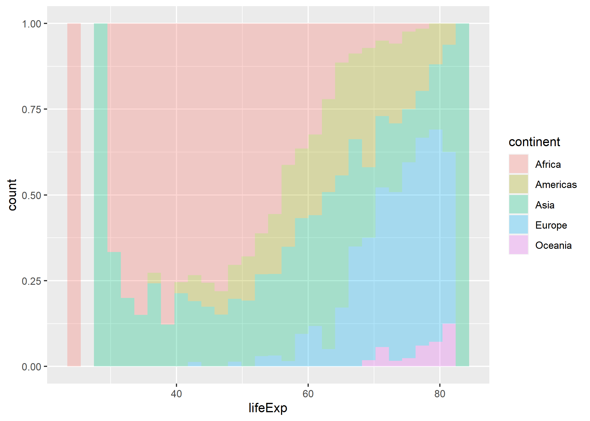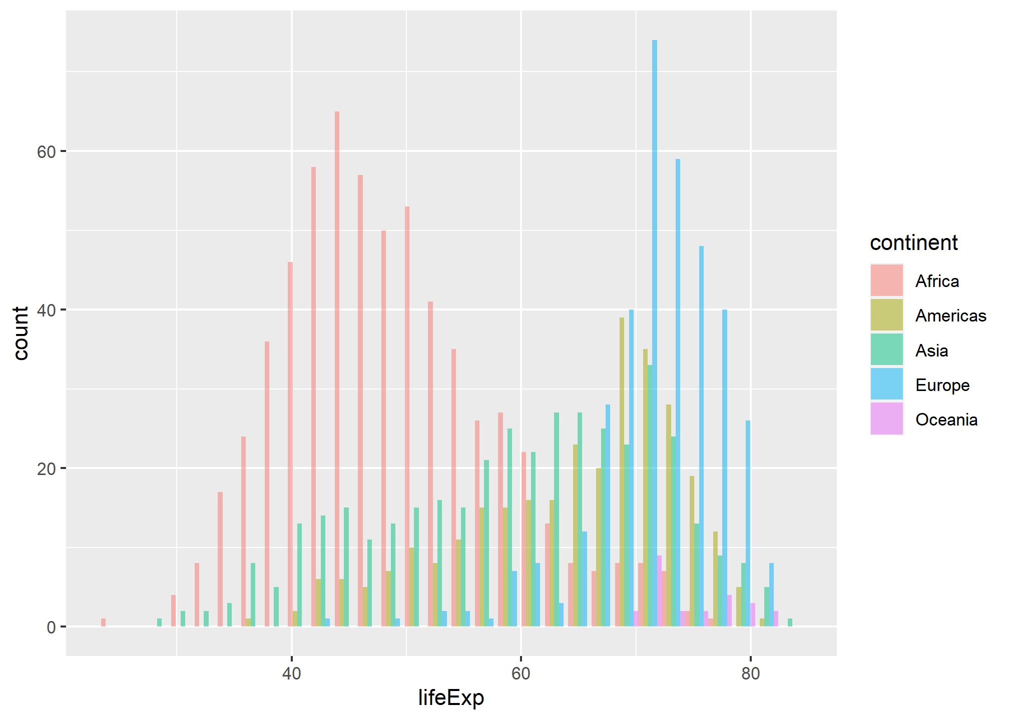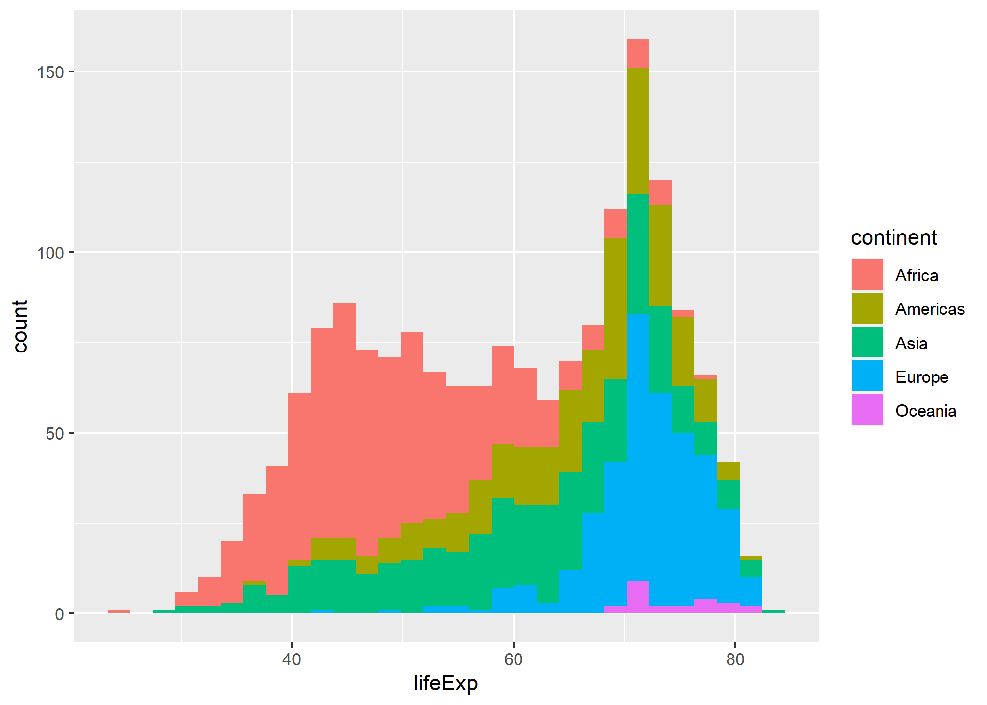 Is this a useful graph? position_stack, the deafult for geom_histogram(), stacks bars on top of each other. Look at the bar that appears right after the 70 year life expectancy. Right at the bottomw, we have a a few observations from, followed by the blue European one, the green Asia, etc. all the way to the top where you see the few red observations that correspond to Africa.