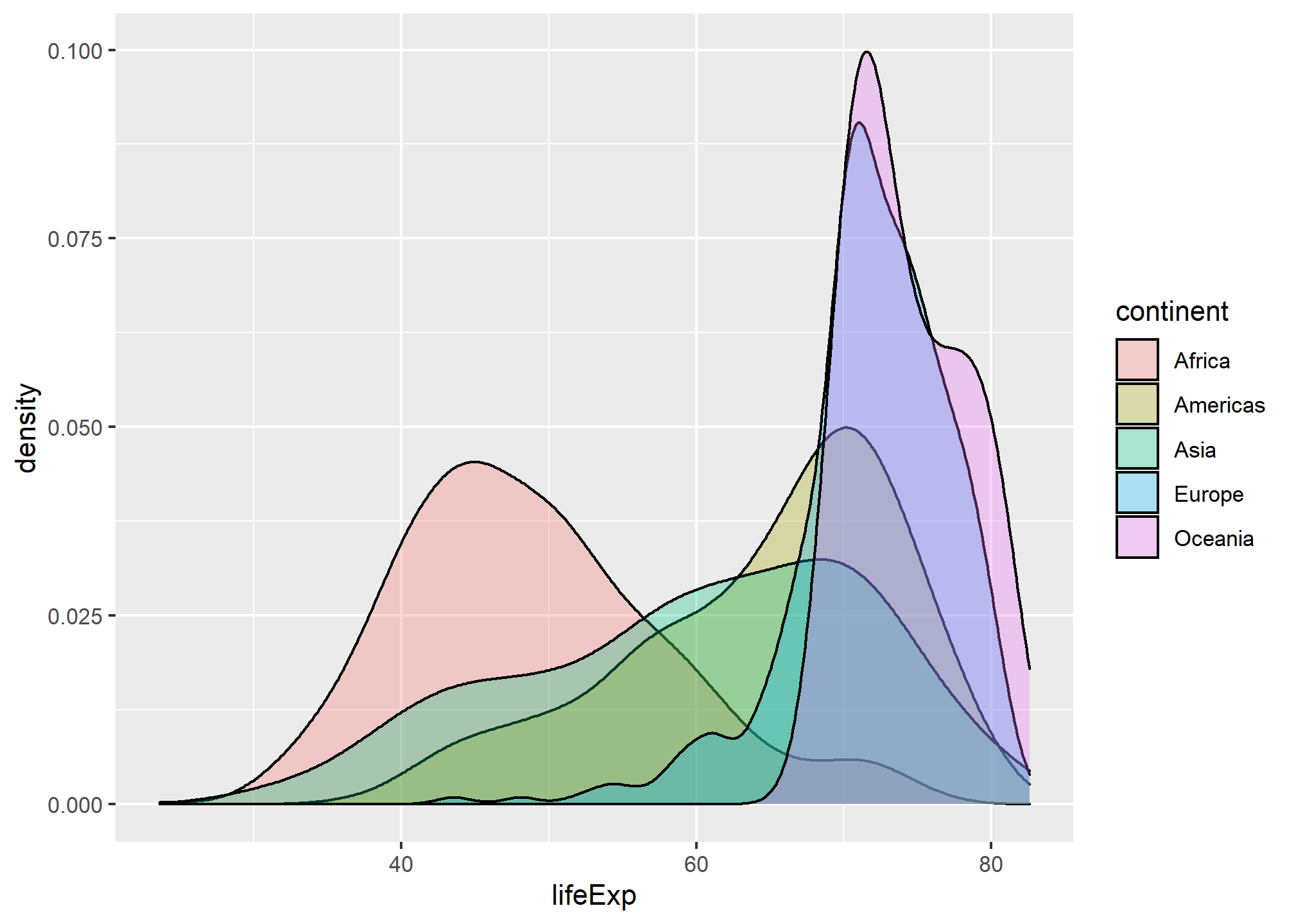 Let us create a base plot of life expectancy, coloured by continent