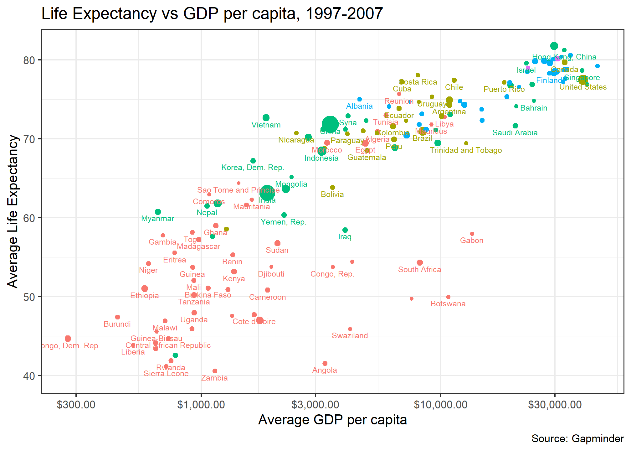 In the example below, we select only those observations between 1997 and 2007, calculate the average life expectancy, average GDP per capita, and average population. We then create a new object, gapminder9707_plot which is the series of commands that make up our plot. To actually see the plot, we either use print(gapminder9707_plot) or just gapminder9707_plot.