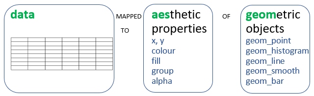 “In brief… a statistical graphic is a mapping from data to aesthetic attributes (colour, shape, size) of geometric objects (points, lines, bars). The plot may also contain statistical transformations of the data and is drawn on a specific coordinates system”