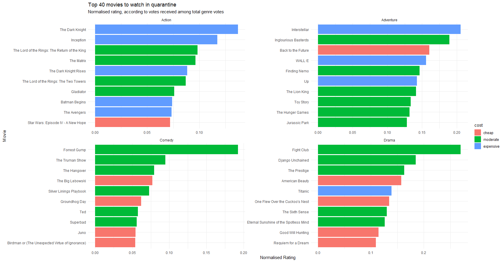 normalised_rating = rating * (votes / total votes in genre) - Arrange movies, so higher