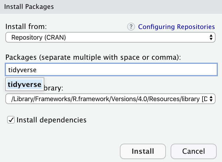 This can sometimes be tedious when you’re installing lots of packages, though. The tidyverse1 for instance, consists of dozens of packages that all work together. Rather than install each package individually, you can install tidyverse, a meta-package if you wish, and get them all at the same time.
