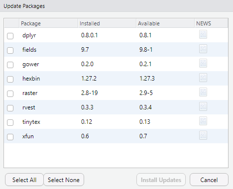 There’s an update.packages function, but it’s probably easier to stick with the RStudio tool. In the packages tab, click on the Update Packages button. This will bring up a window that looks like the one shown below: