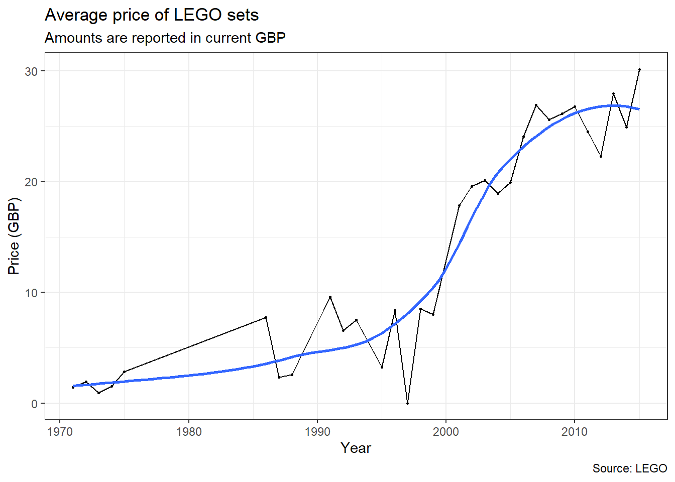 The dataframe has 14 variables (or columns) and 6,172 observations (rows). Besides the item number, year, theme/subtheme and the number of pieces and minifigures contained in each Lego box, we also have the recommeneded retail prices in GBP, USD, CAD, and EUR. While we are at it, let us have a quick look at how Lego prices (in GBP) have evolved over the years.
