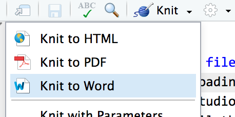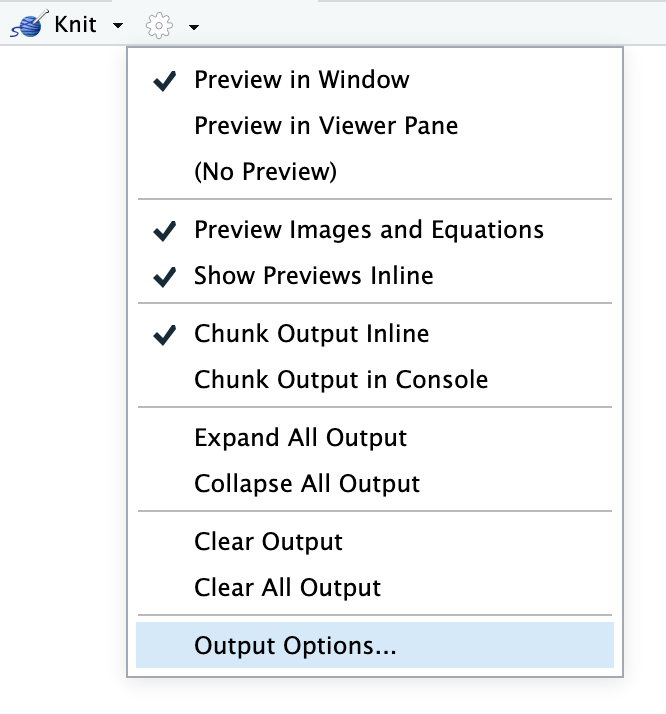 You can also click on the down arrow on the “Knit” button to choose the output and generate the appropriate YAML. If you click on the gear icon next to the “Knit” button and choose “Output options”, you change settings for each specific output type, like default figure dimensions or whether or not a table of contents is included.