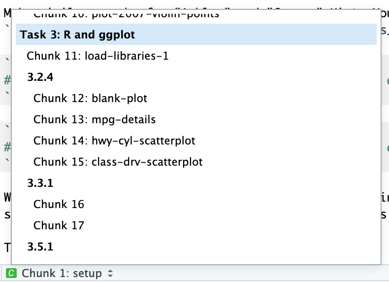 You can add names to chunks to make it easier to navigate your document. If you click on the little dropdown menu at the bottom of your editor in RStudio, you can see a table of contents that shows all the headings and chunks. If you name chunks, they’ll appear in the list. If you don’t include a name, the chunk will still show up, but you won’t know what it does.